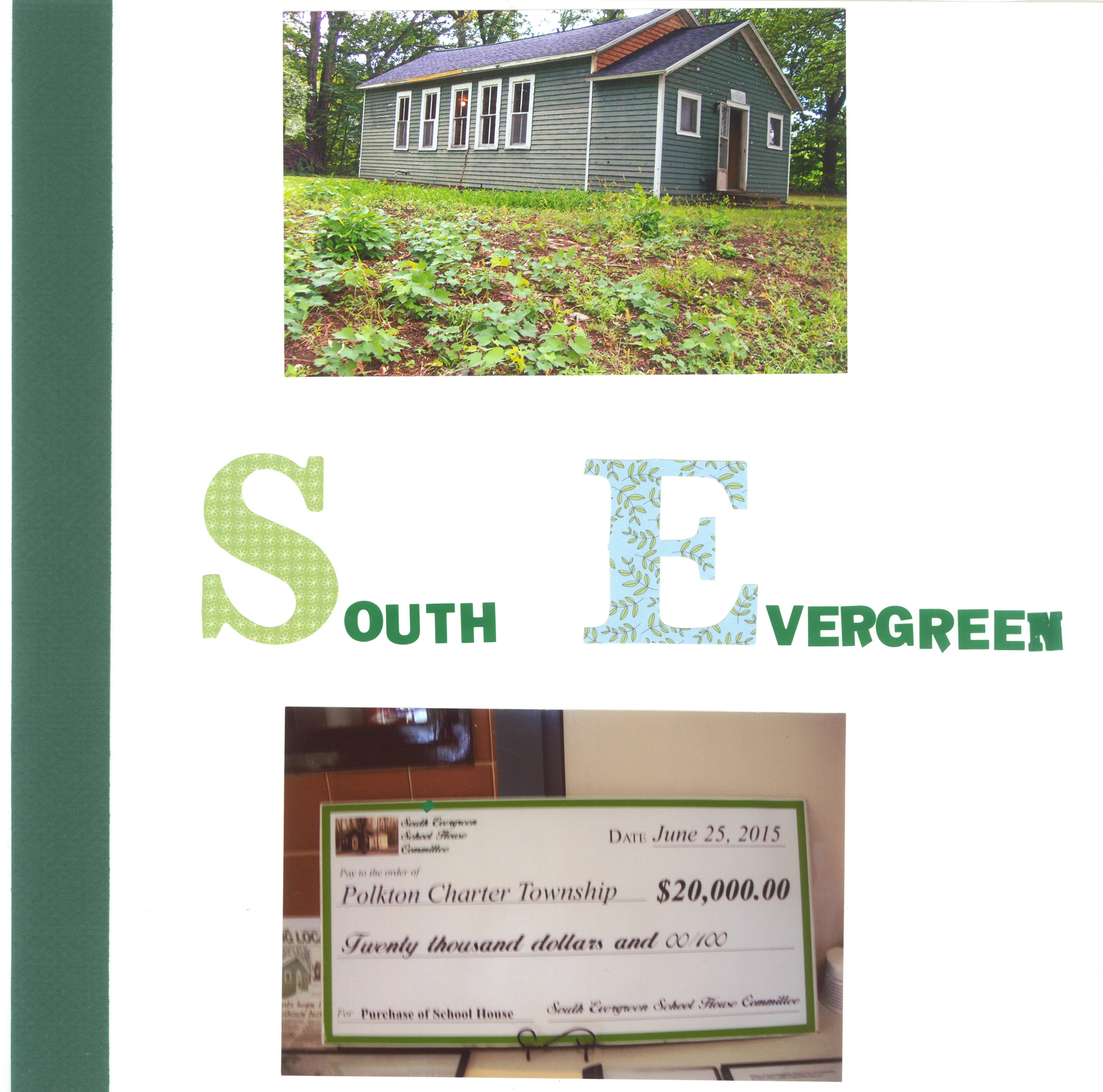 A check from the South Evergreen Committee to Polkton Township. Polkton Township used this money to purchase the South Evergreen Schoolhouse. |
