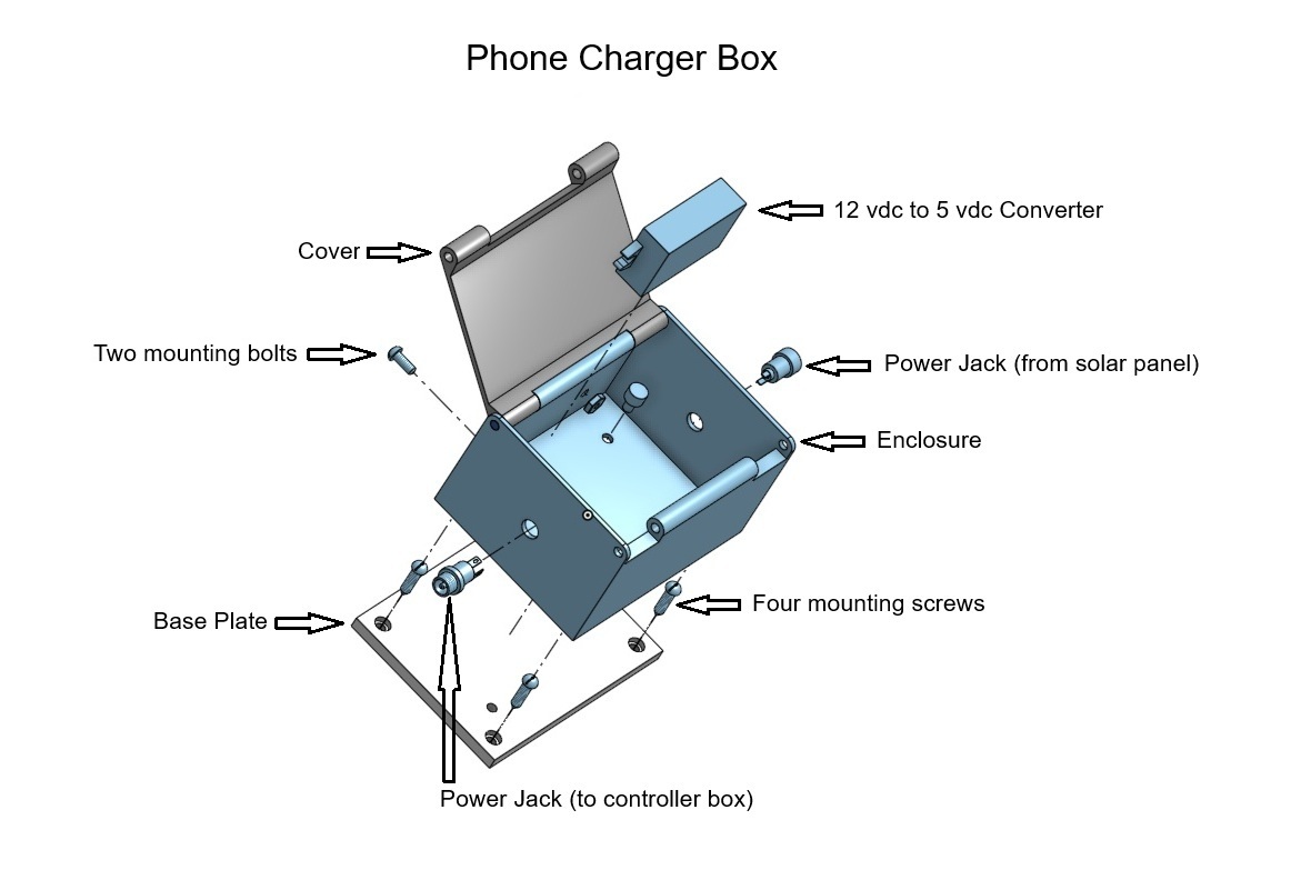 The 12 volt DC voltage from the solar panel can be routed through the phone charger box and then on to the controller box.